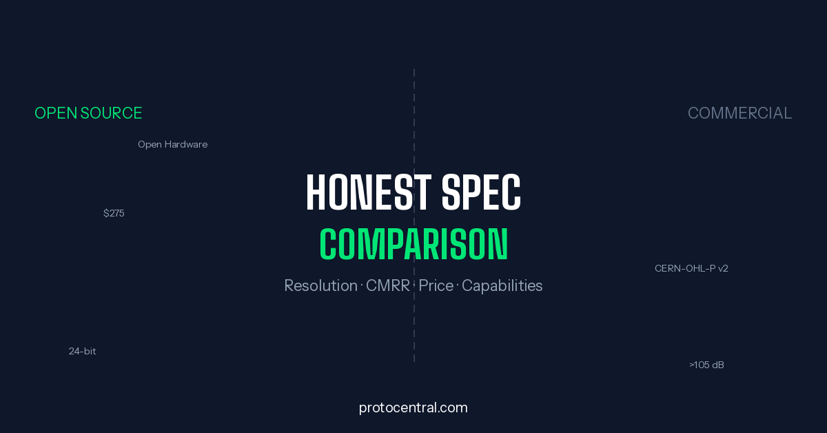 A transparent, spec-driven comparison of ProtoCentral’s open source biosignal hardware against Biopac, ADInstruments, Delsys, OpenBCI, and other commercial systems. No marketing spin — just numbers, capabilities, and trade-offs.